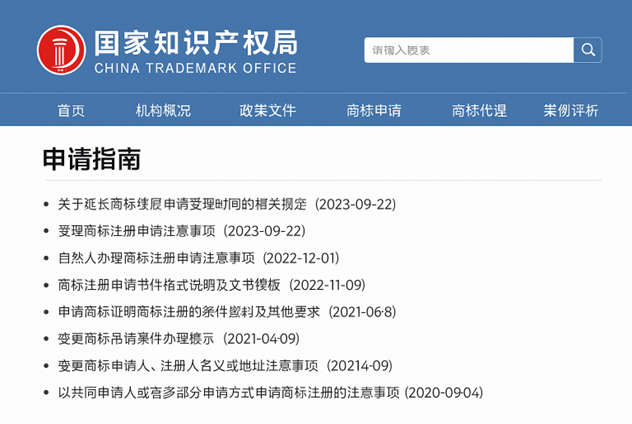 Open your web browser and visit the CNIPA website, specifically the “Trademark Application” section at http://sbj.cnipa.gov.cn/sbj/sbsq/sqzn/. On the homepage, you will see a blue header with the CNIPA logo and a navigation menu in Chinese (e.g., 首页, 机构概况, 政策文件, 商标申请). On the right side, there is a search bar. Below is an example of what the page looks like: